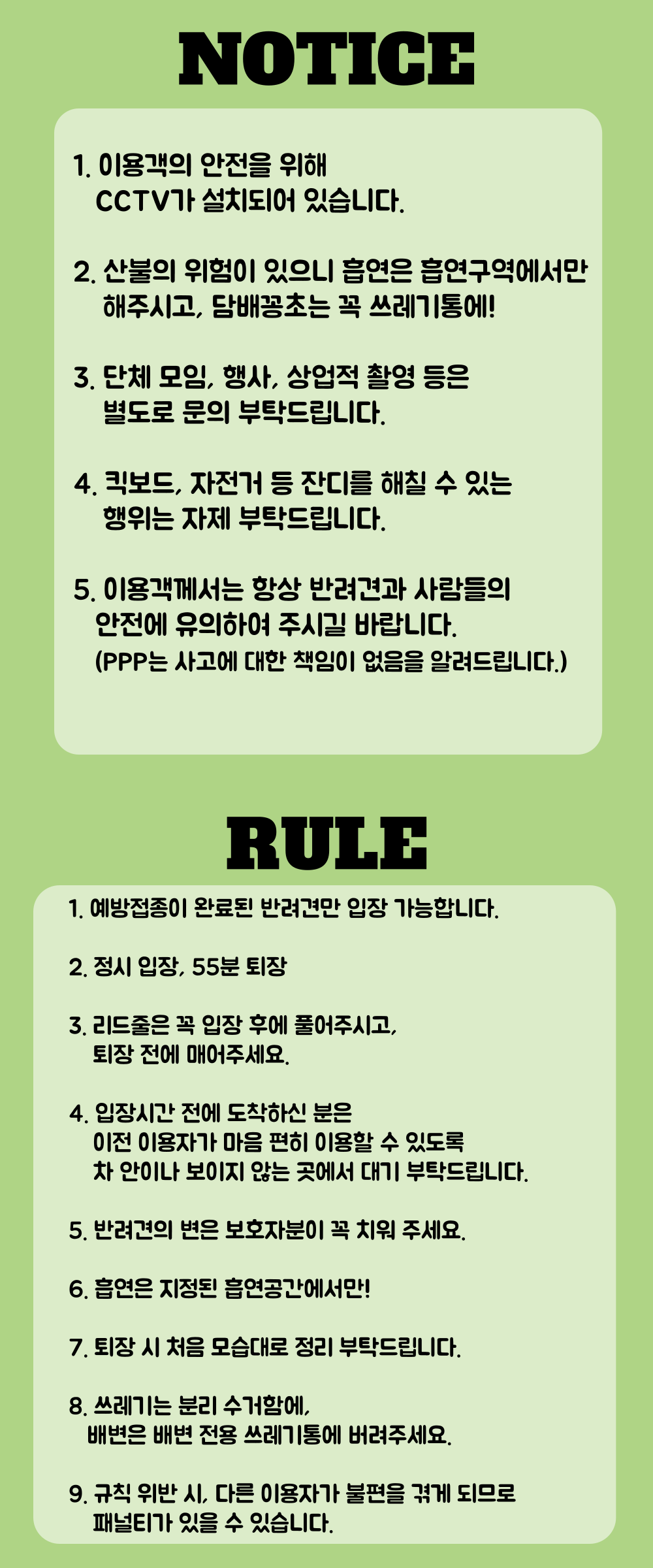 ✔ 이용객께서는 항상 반려견과 사람들의 안전에 유의하여 주시길 바랍니다. (P.P.P는 사고에 대한 책임이 없음을 알려드립니다.)
